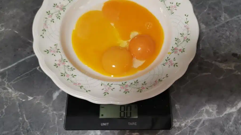 - Add four eggs to a bowl and weigh them without the shell. Afterward, add water and mix everything.