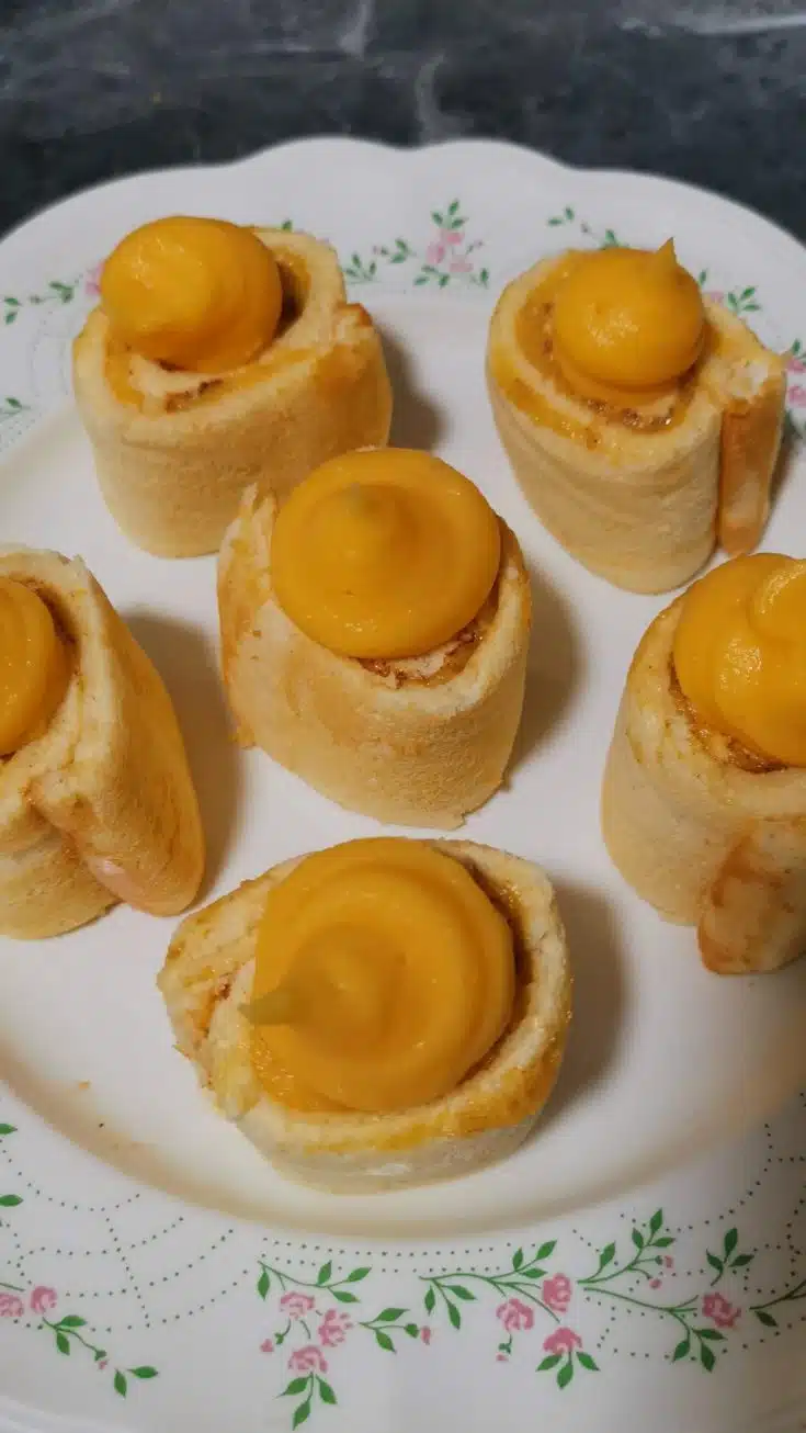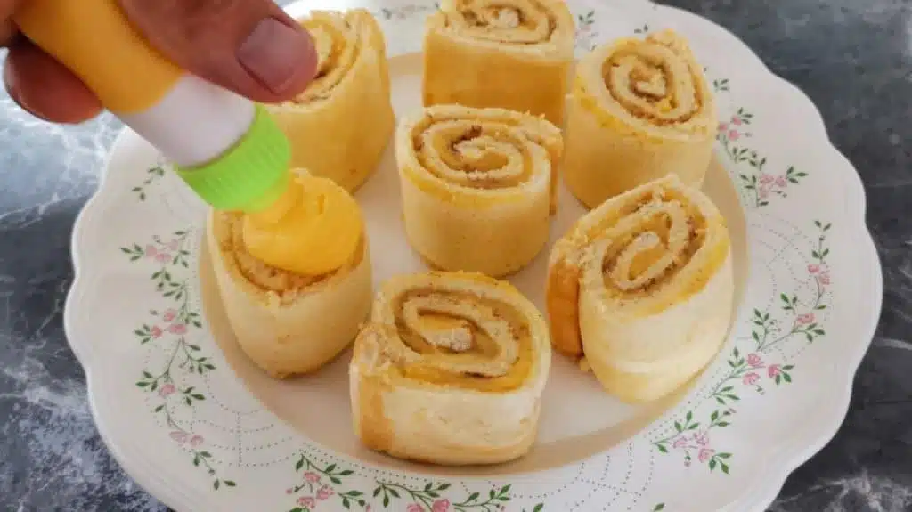 - Crown each Pionono with a portion of the Pastry Yolk and sprinkle with sugar. Afterward, place the Piononos under the grill for a couple of minutes.