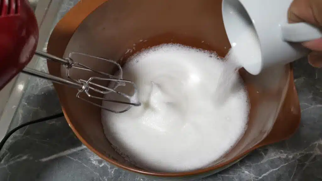 - Whip the egg whites in another bowl and, when they are foamy, add sugar, little by little.