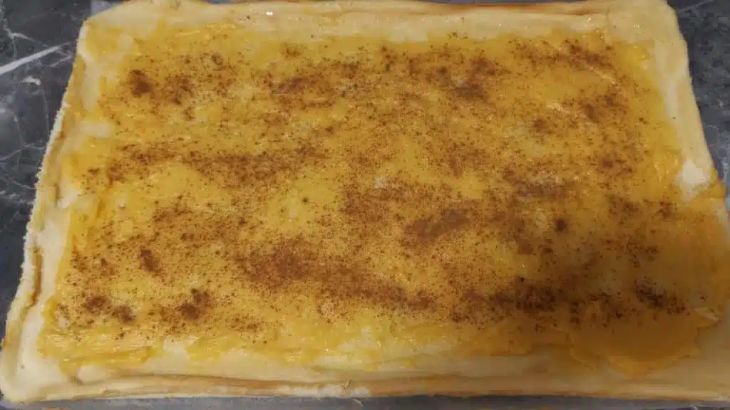 - Cover the sponge cake with the Pastry Yolk (leave around 1/3 of the Pastry Yolk for later to crown the Piononos) and sprinkle with ground cinnamon.