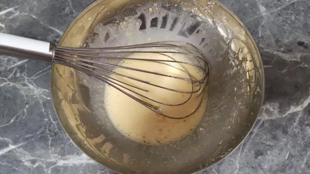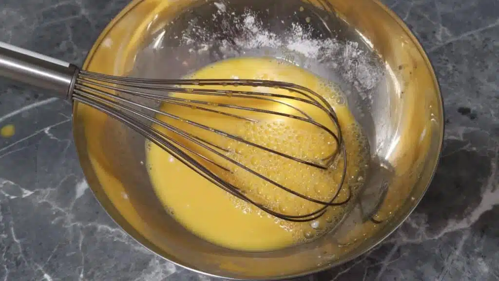 3. Die Zucker-Mehl-Mischung in die Schüssel mit den Eiern geben und gut verrühren, bis keine Mehlklumpen mehr vorhanden sind.