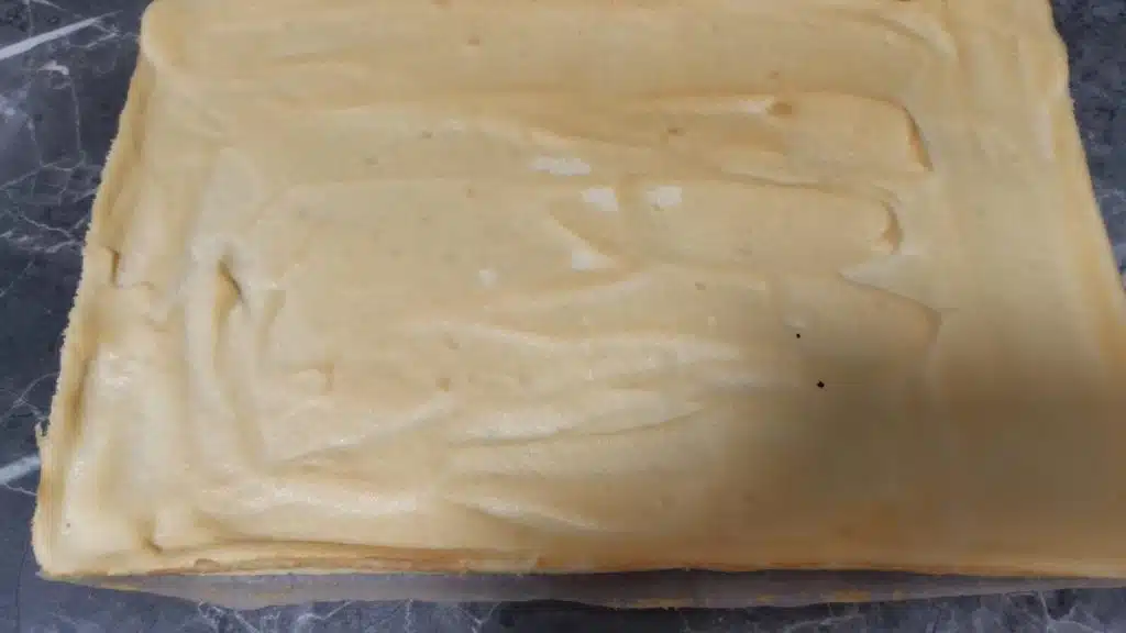 Dann wird das Mehl vorsichtig untergehoben, damit ein glatter und luftiger Teig entsteht. Der Teig wird auf ein Backblech gestrichen und gebacken, bis er goldbraun ist.