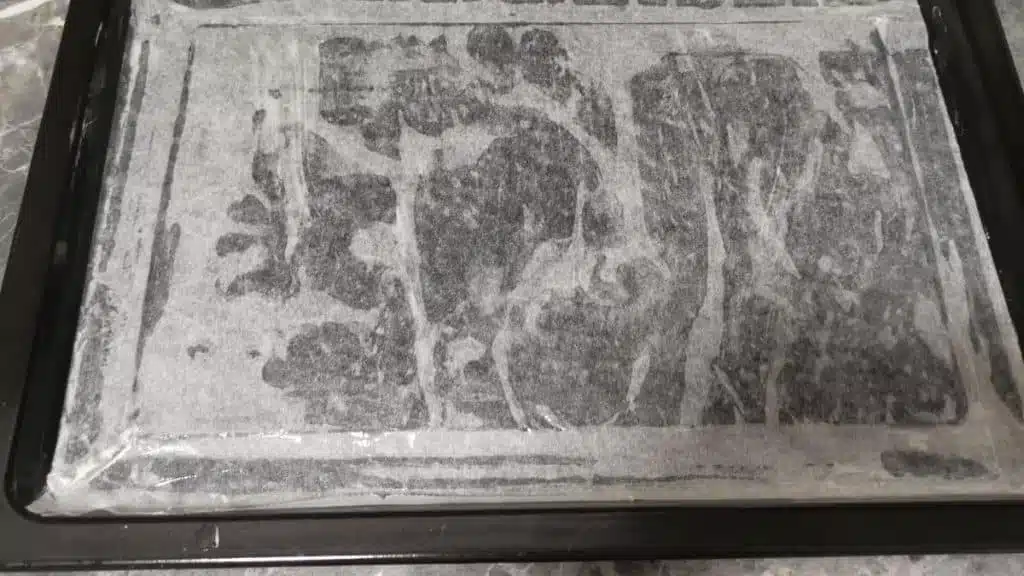 - Pour the mixture on the baking paper and spread it over the entire surface, making sure it is of equal thickness.