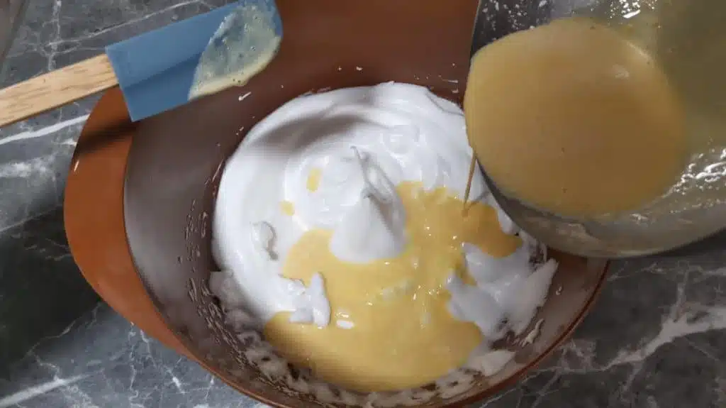 - Add the egg yolk mixture and mix everything well with a spatula. Use smooth and enveloping movements from bottom to top to not to lose the air incorporated with the beating.