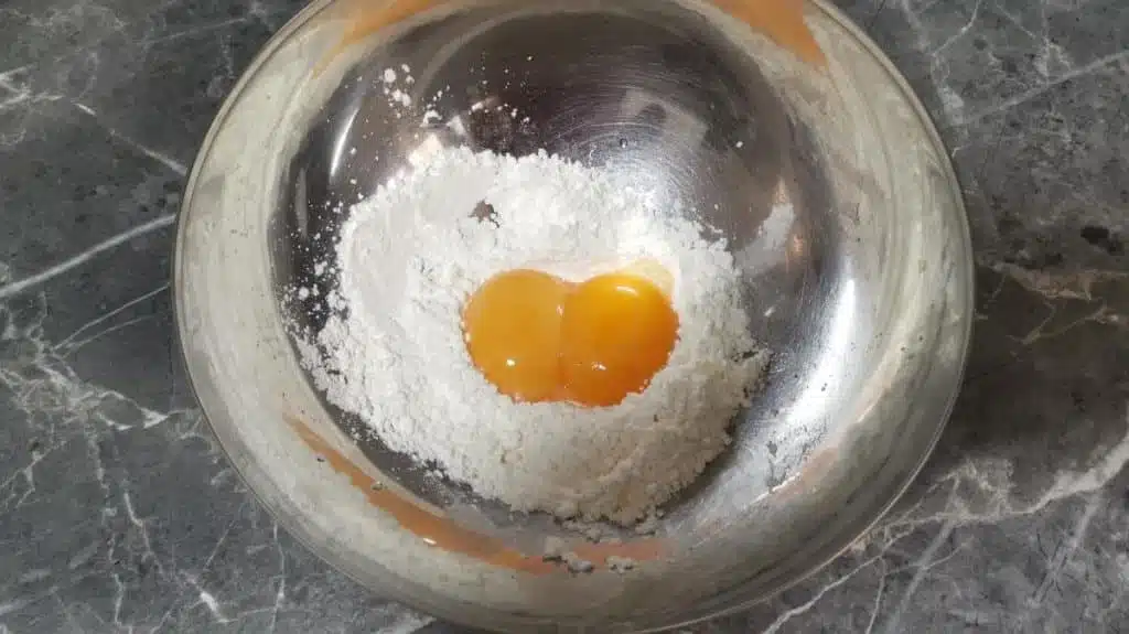 3. Trenne das Eigelb vom Eiweiß und gib das Eigelb in die Schüssel mit dem Mehl. Stelle das Eiweiß für eine spätere Verwendung beiseite.