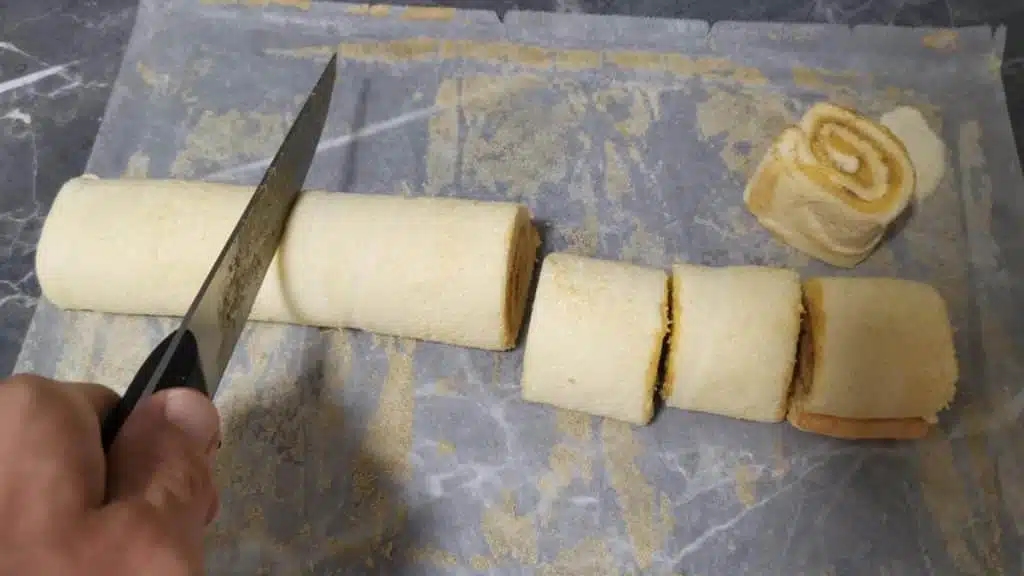 - Roll the filled sponge cake on the long side and cut it in around 0.8 inches (2 cm) pieces.