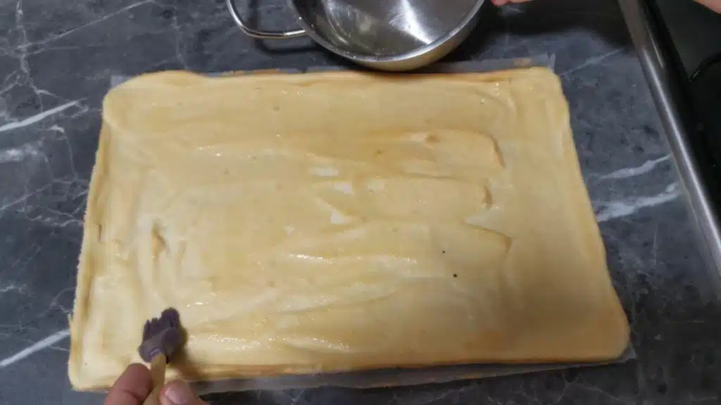 - Brush the sponge cake with the syrup.