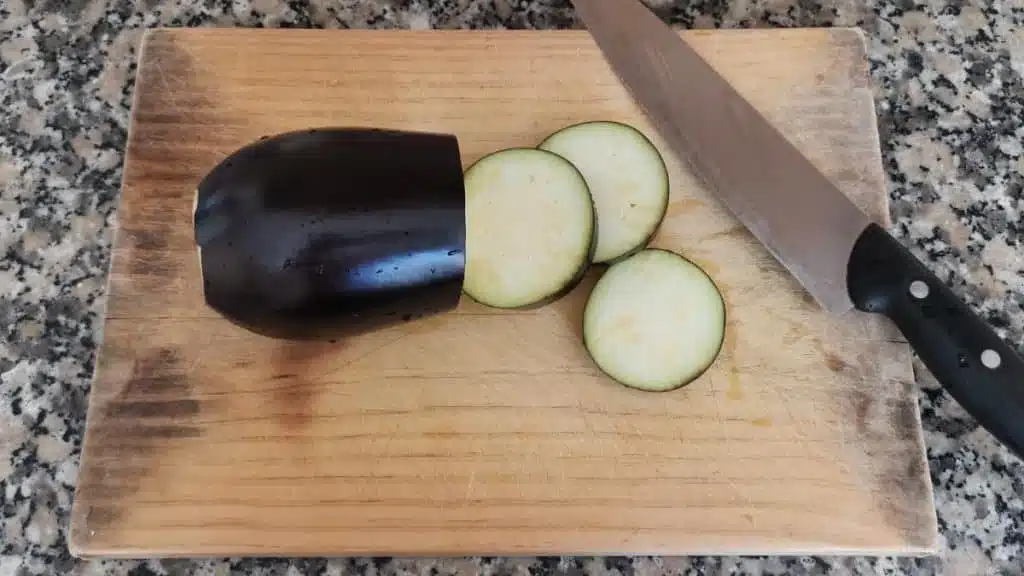 1. Precalienta el horno. Lava y corta la berenjena en rodajas de aproximadamente 1 centímetro de grosor.