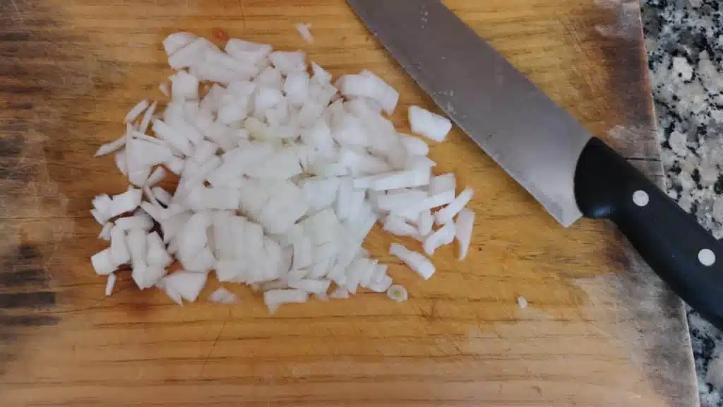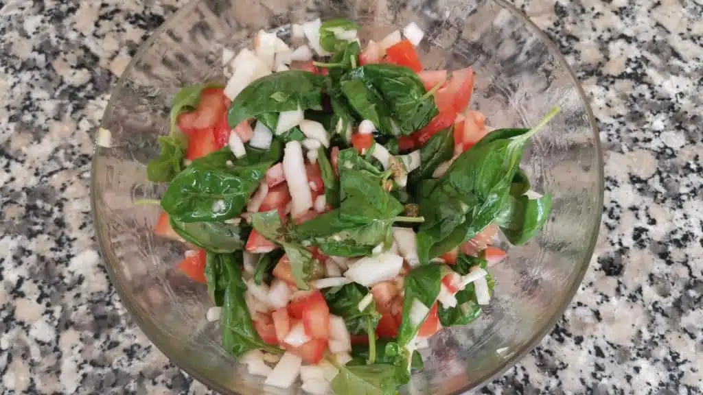 4. Pela la piel de la cebolla finamente y colócala en el mismo recipiente que los tomates.