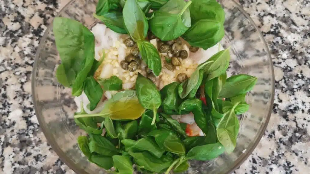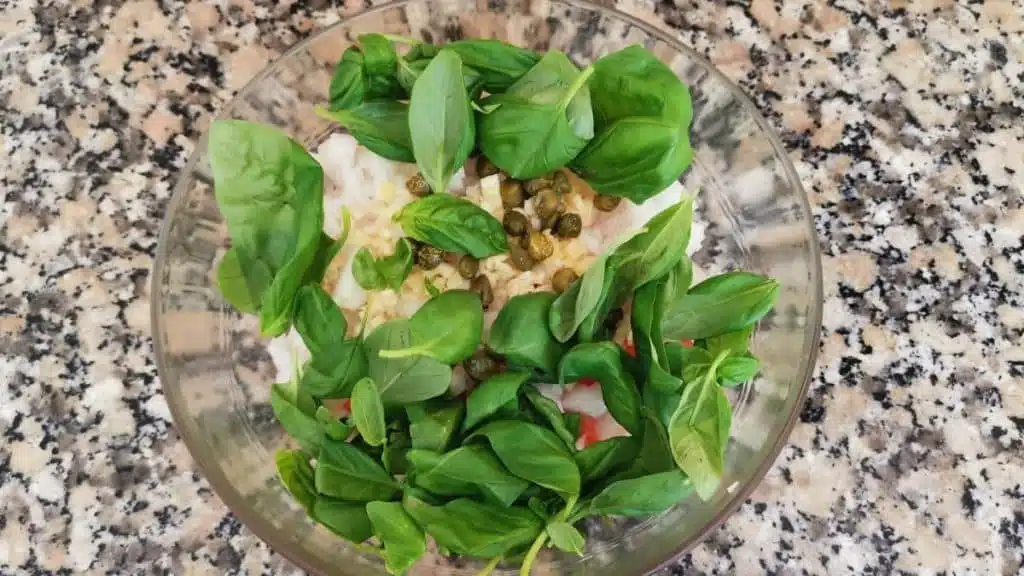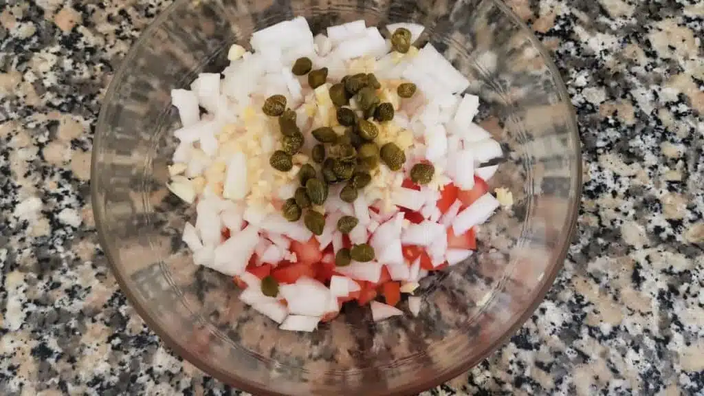 5. Saca algunas alcaparras del frasco sin el líquido. Mézclalas en el bol con los demás ingredientes.