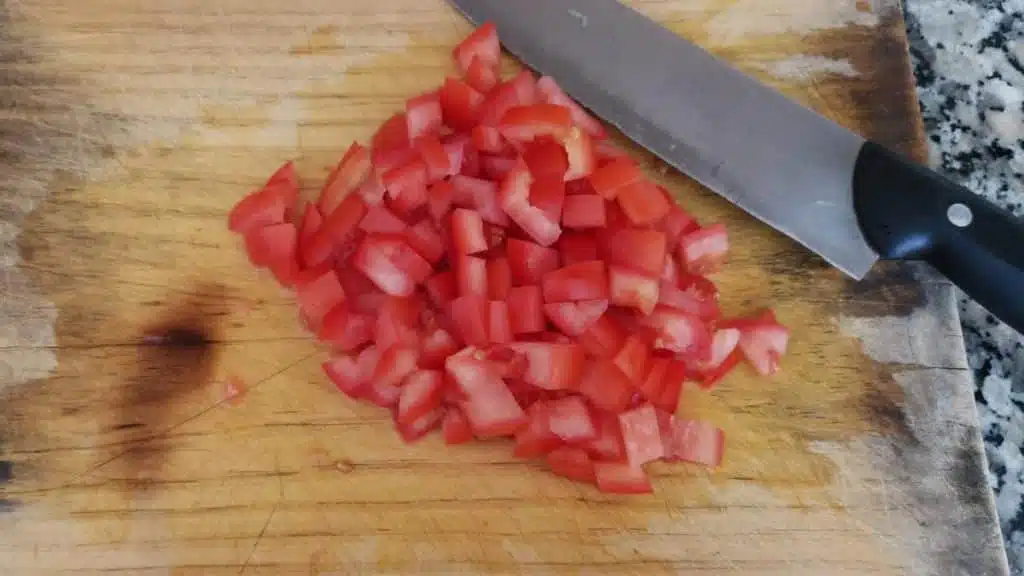 3. Mientras que las rodajas de berenjena se hornean, pica los tomates en cuadritos sin el corazón ni las semillas, déjalos reservados a un lado.