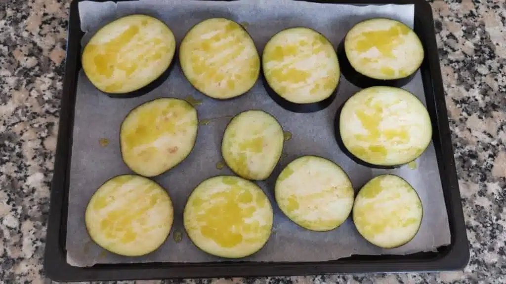 2. Coloca las rodajas de berenjena en una bandeja para hornear. Rocía o cepilla un poco cada rebanada con aceite de oliva. Coloca la bandeja en el horno y espera hasta que estén doradas por un lado y dales la vuelta, repite el rocío con aceite de oliva y colócalas de nuevo en el horno.