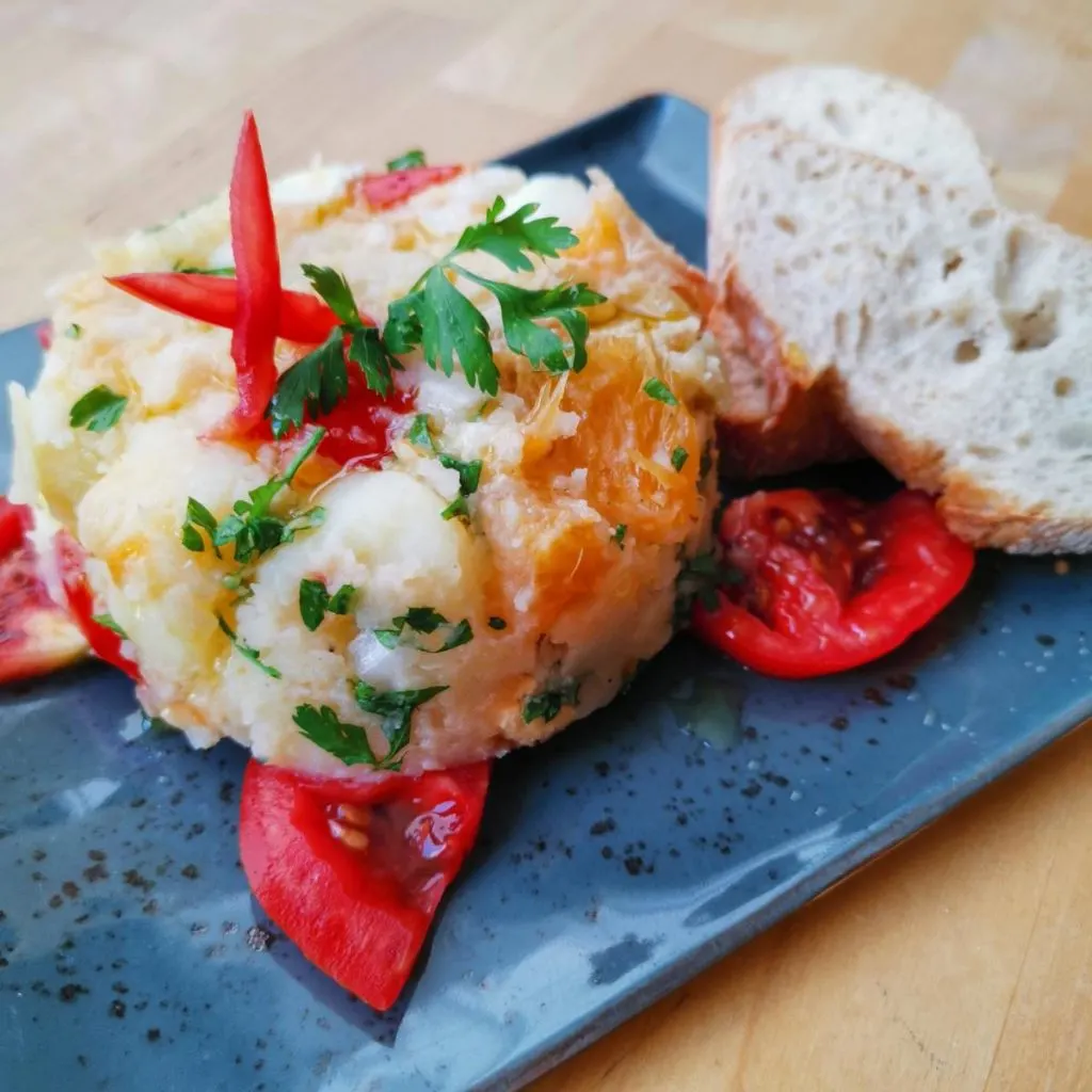 Oltre al merluzzo, i peperoni sono conditi con pezzi di merluzzo strappati. Per condire questo piatto si usano aglio, sale e olio d’oliva.