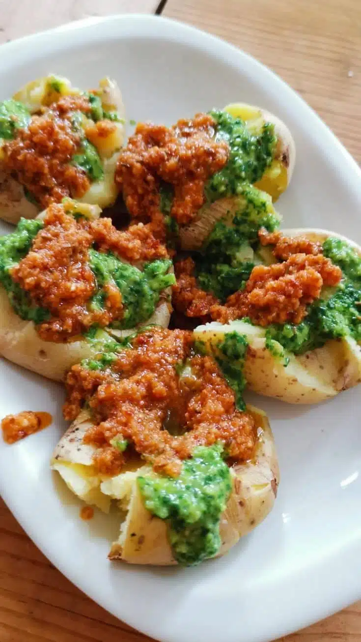 Consiglio: ti consiglio di schiacciare le patate in un piatto a parte e poi coprirle con il mojo Verde e il mojo picon.