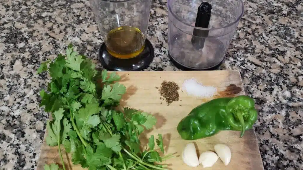 1. Aggiungere tre guanti d’aglio, peperoncino verde (mezzo peperoncino o più, a seconda del livello di piccantezza preferito), coriandolo (tritato grossolanamente), un filo di aceto di sherry, 3 once (circa 90 ml) di olio extravergine d’oliva, cumino e sale marino in un frullatore o robot da cucina.