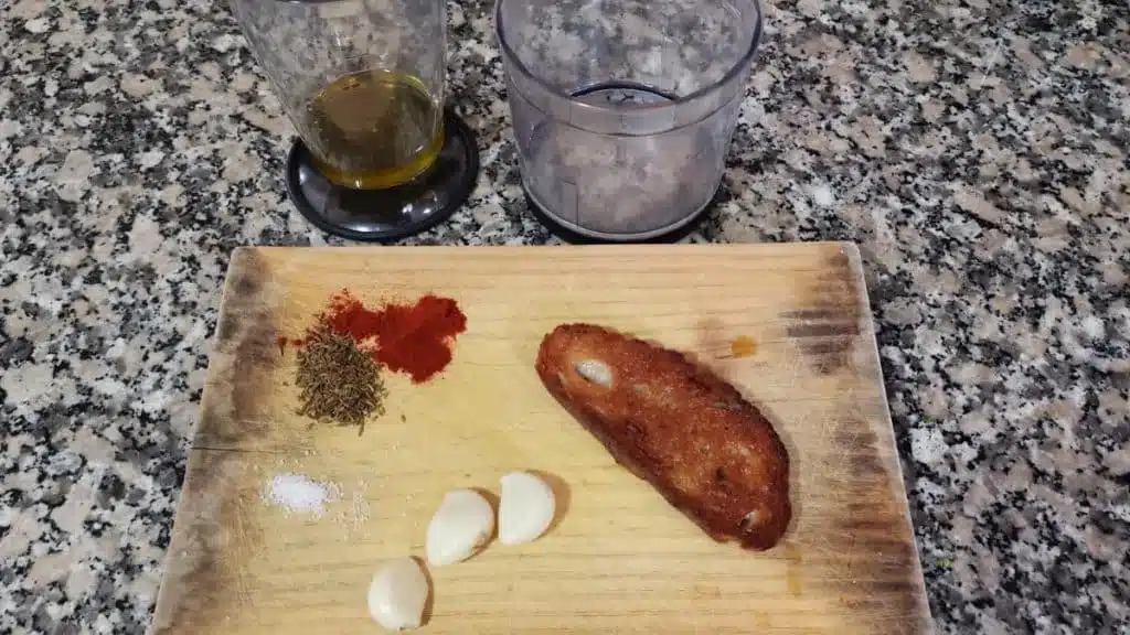 3. Aggiungere i dadi di pane, l’aglio, un filo di aceto di sherry, 3 once (circa 90 ml) di olio extravergine di oliva, mezzo cucchiaio di paprika dolce, 2 peperoncini di cayenna secchi, sale marino e cumino nel frullatore o nel robot da cucina.