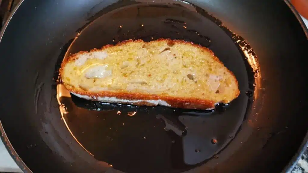 1. Scaldare dell’olio d’oliva extra in una padella e aggiungere una fetta di pane. Rivestirlo su entrambi i lati in olio d’oliva e tostarlo fino a quando entrambi i lati sono croccanti.
