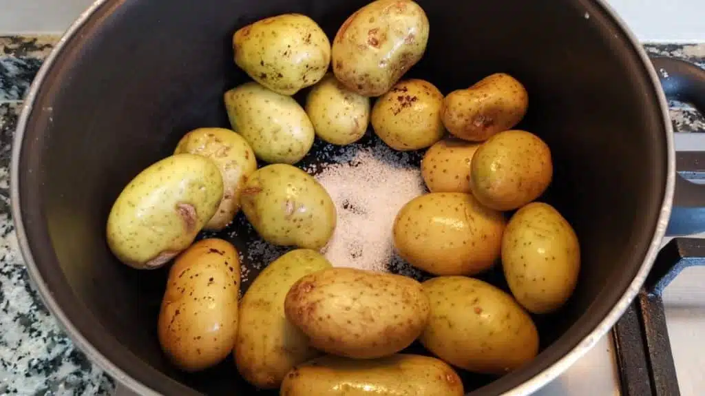 - Aggiungi le patate con abbondante sale marino in una pentola e aggiungi acqua quanto basta per coprirle.