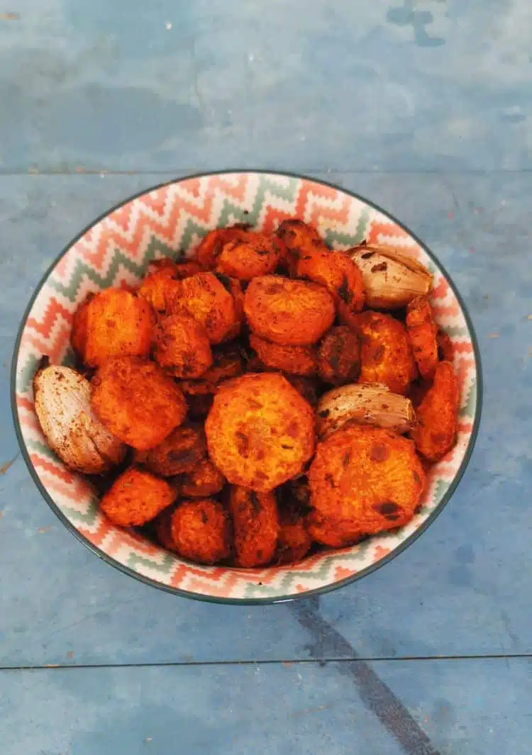 Then add the carrot rounds to a large bowl together with the garlic (skin on).