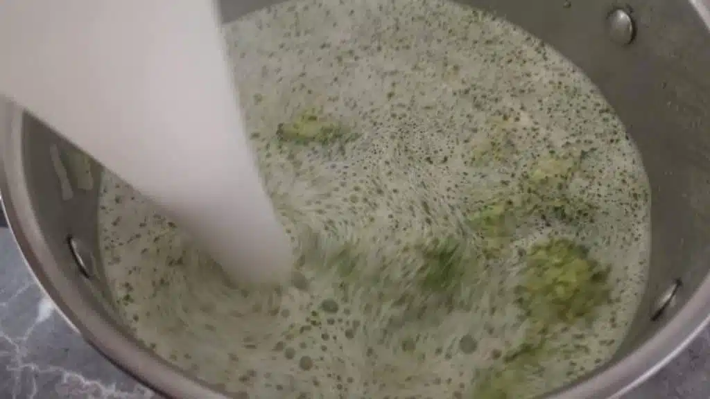 - Cut the broccoli into small pieces and remove part of the stem. Add the broccoli and six cups of chicken broth to the pot. Let it cook for around ten minutes.