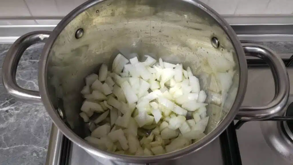 - Heat up extra virgin olive oil in a pot over medium heat and add one thinly chopped medium-sized onion. Fry for around five to ten minutes until the onion starts to golden.