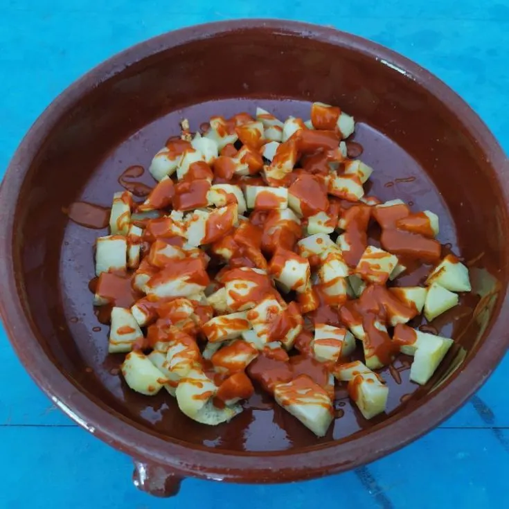 To make this incredible recipe, potatoes are cut into irregular tiny chunks, fried, and dressed in a hot spicy tomato sauce, which is also poured over them later.